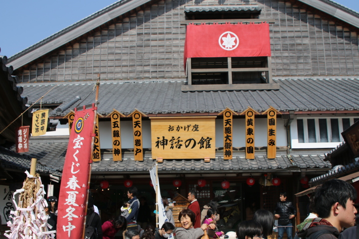 また、日本の神話をテーマにした体験施設「おかげ座 神話の館」では、神話のあらまし(国生みから天孫降臨まで)を映像と和紙人形などで展示しています。毎日がお祭りのように賑わい、いつもたくさんの観光客であふれています